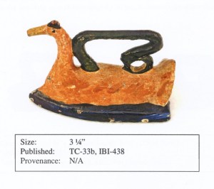 Jim & Robin Geisert’s book “Tuesday’s Reflections” discusses this iron. “The story of Ray Harpel and his homemade swans and geese were thoroughly documented in Tuesday’s Children. They were made during the early 1940s and given to friends and family members. They vary considerably in shape and finish. This goose shows particular charm with it’s unusual yellow coat with brown feather highlights and dark blue base.” The next photo of the Harpel Goose is from the Geisert’s book.