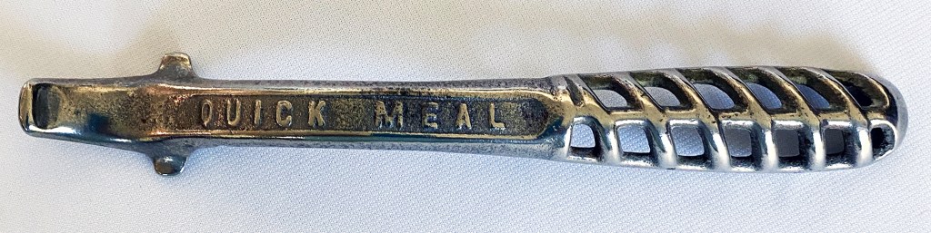 A stove lid lifter was used to lift the circular openings on the top of a cast iron stove. This 8″ long antique nickel-plated cast iron stove lid lifter is in excellent condition. On face: QUICK MEAL. On reverse: D62. Circa late 1800s – early 1900s.