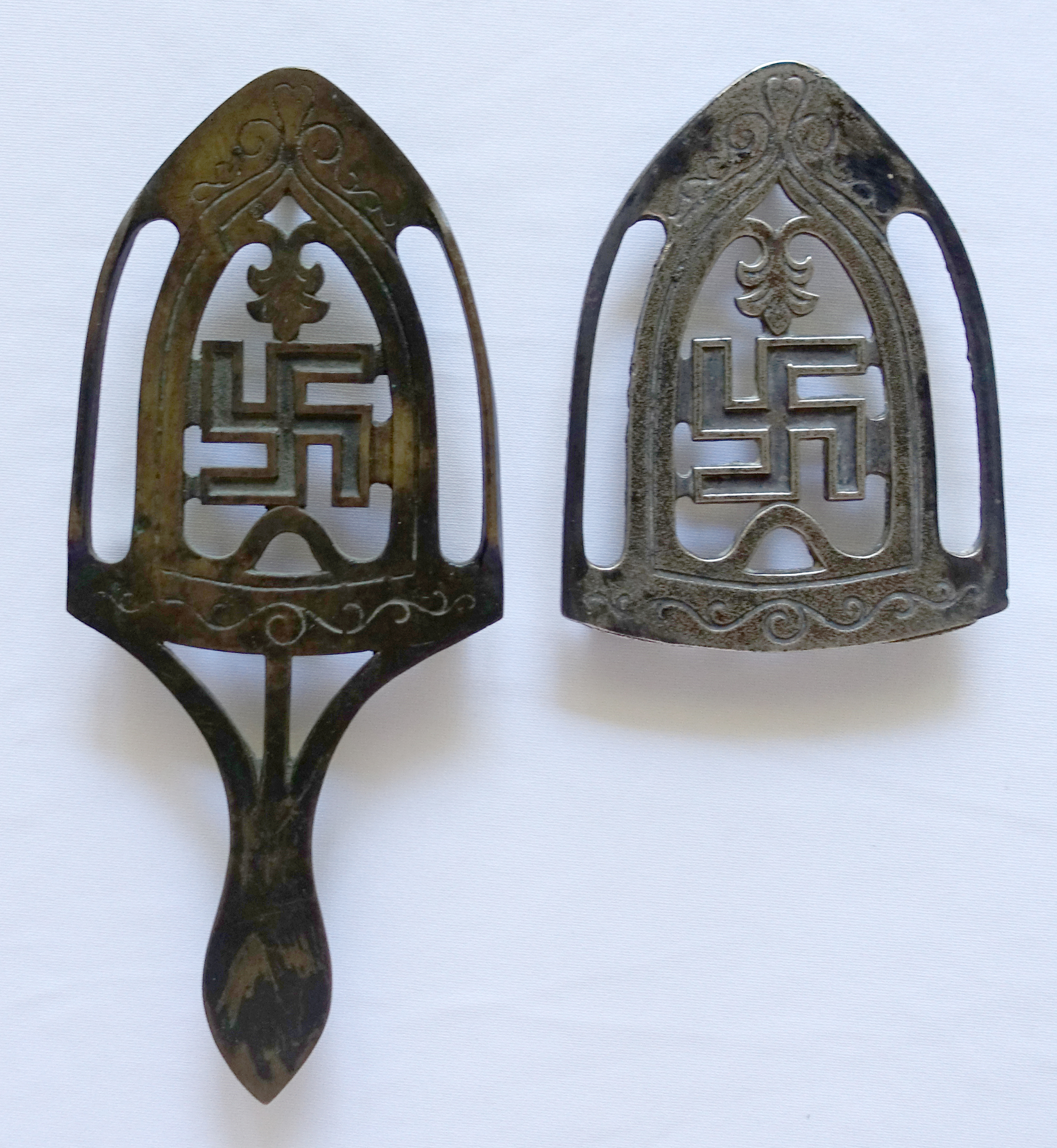 Both of these sad iron stands in my collection feature a swastika; the version with a handle is very rare. Neither stand is marked on front or back as to the manufacturer. I would date these stands to the late 1800s-early 1920s.