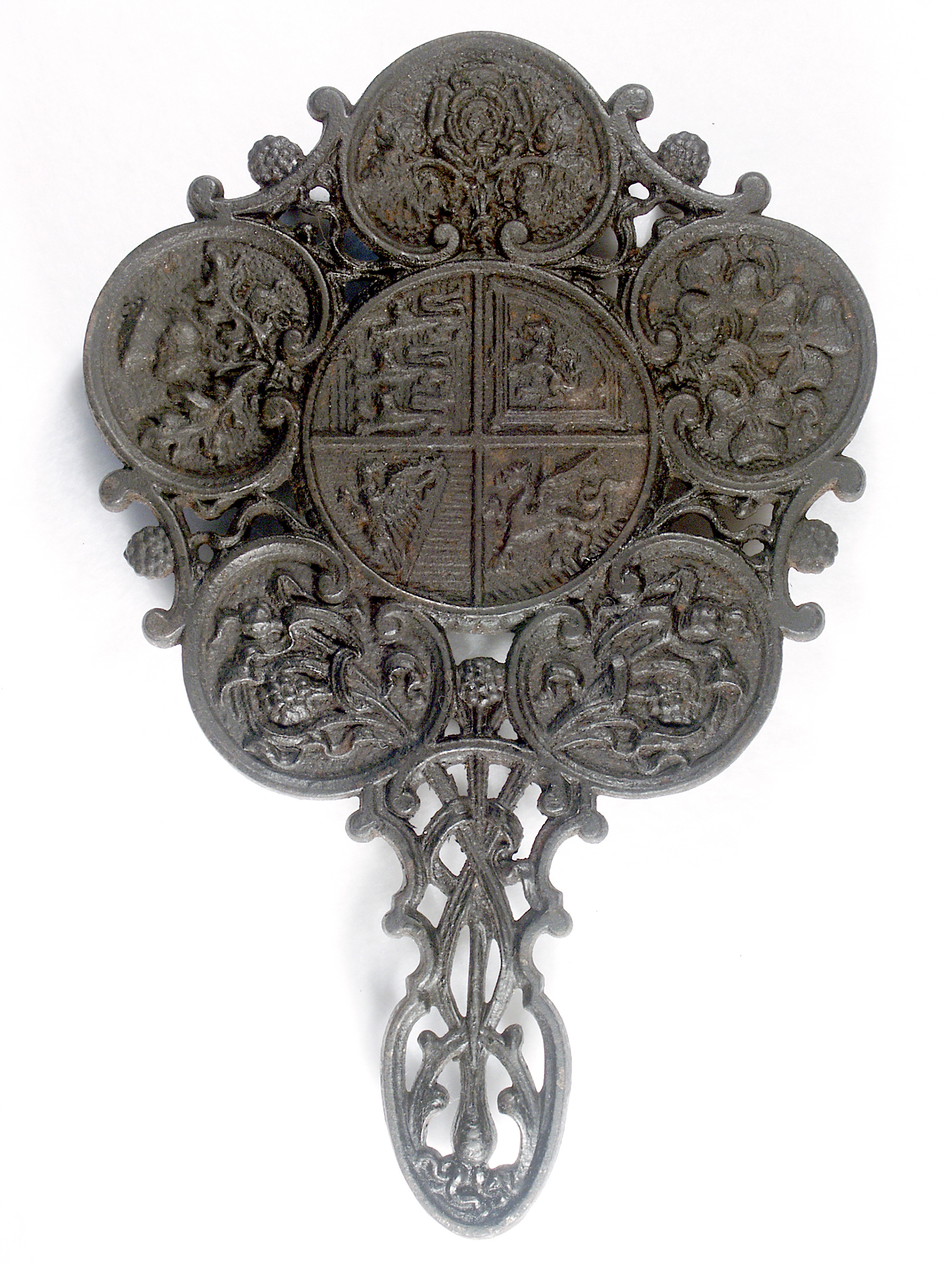 British, cast iron, 9 7/8″ x 6 1/2” w/four 1 1/4” legs. There is a center bracket on the reverse (adjustable and removable) allowing attachment to a parlor stove or fireplace fender. It features the national emblems and flowers of England, Ireland, Scotland and Wales. On the reverse is the Registered Design number No. 331413 (for 1899).