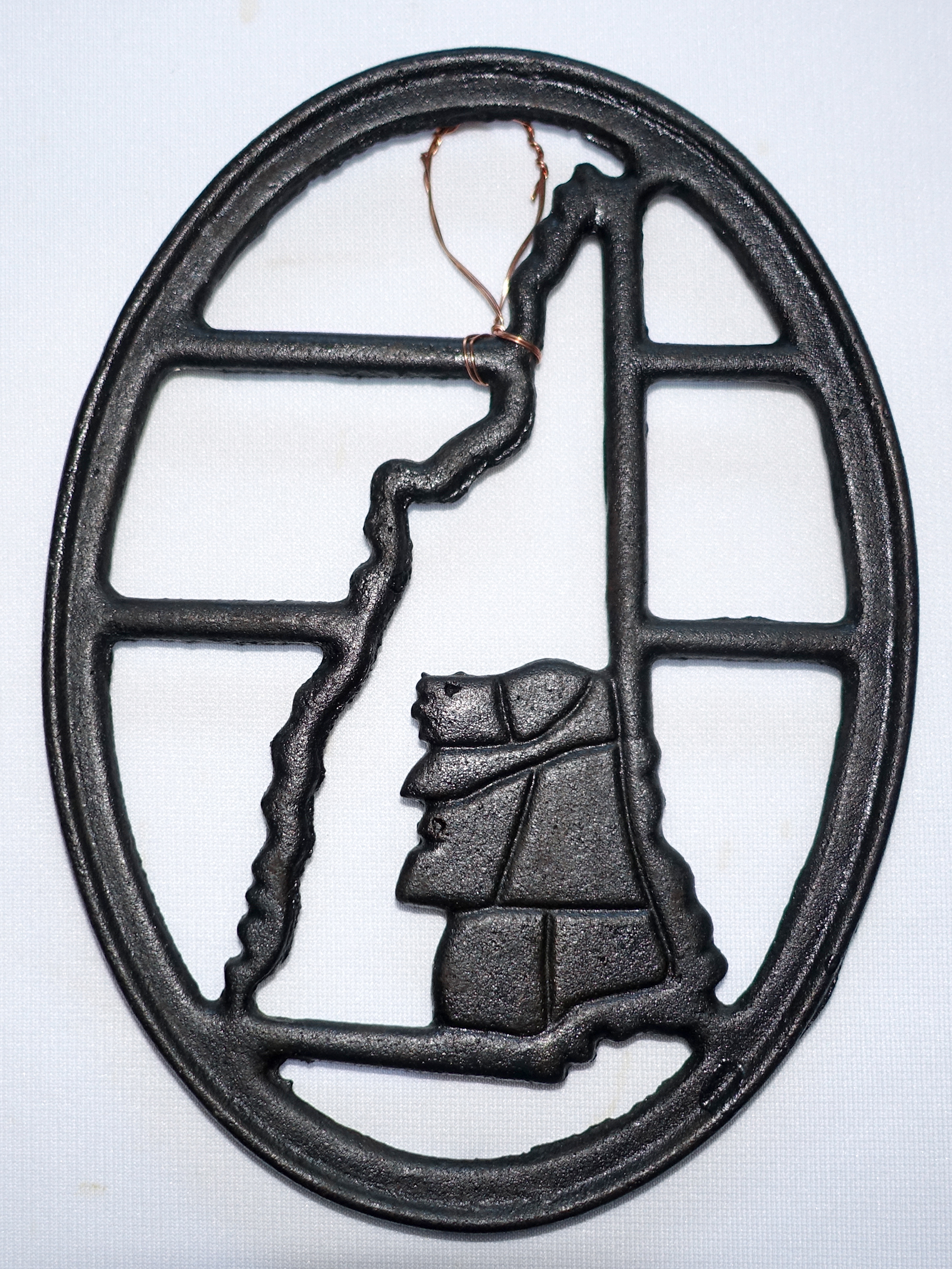 I have two trivets commemorating The Old Man of the Mountain. The first is a cast iron trivet signed PORTLAND STOVE FDRY (foundry) PORTLAND ME. Dimensions: 7 1/8″ x 5 1/4″ w/four feet; circa 1950-1970. Portland Stove Foundry was founded in 1877 and was best known for their cast iron cooking and parlor stoves. The company filed for bankruptcy in January 1979, stating they could no longer compete with foreign imports. PSF ceased production in 1984. The physical foundry was destroyed by fire on October 13, 1994.