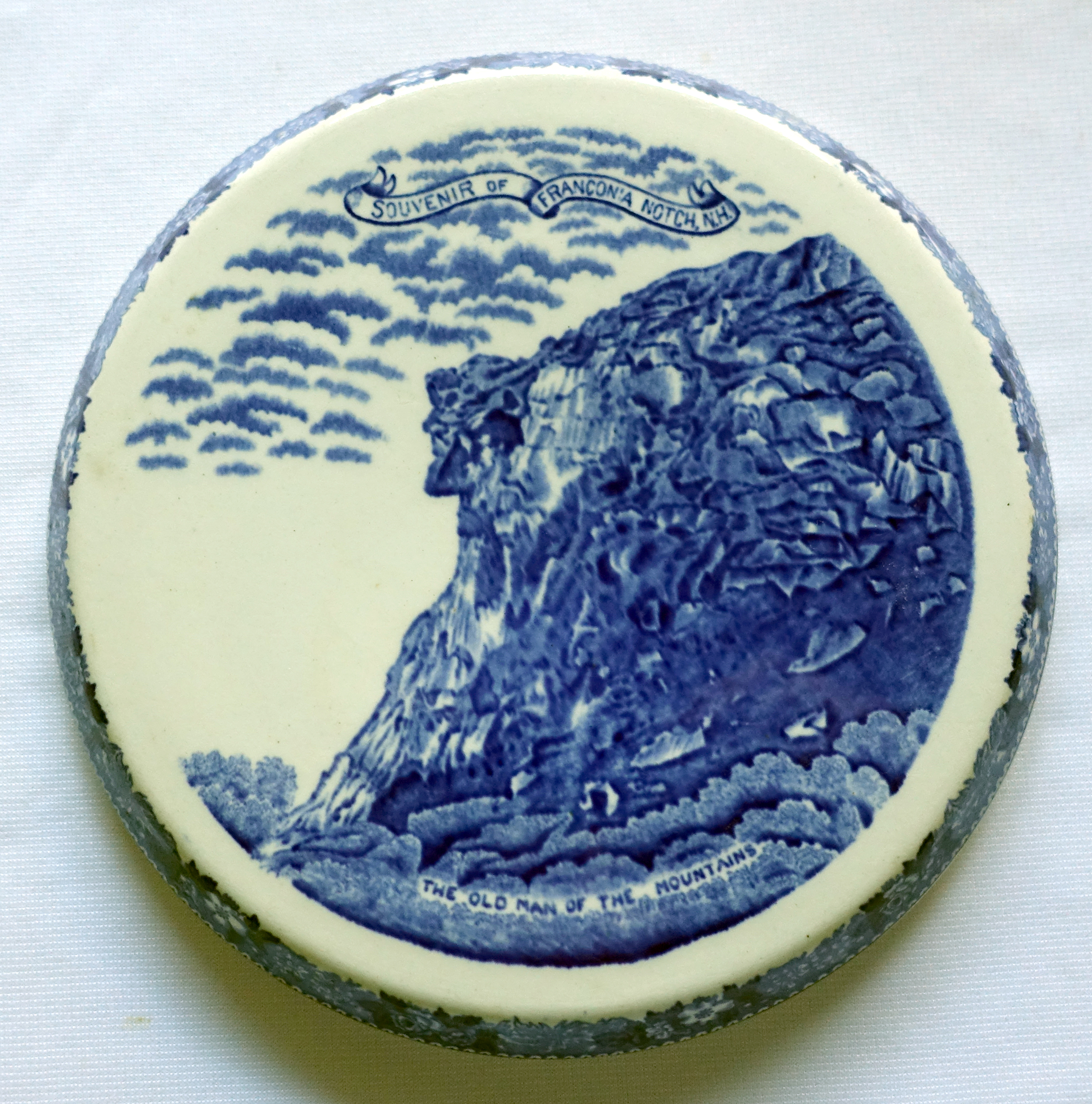 The second is a “The Old Man of the Mountains” ceramic souvenir signed Old English Staffordshire Ware. It has an early Jonroth England logo (used since 1909) and is marked “Imported for the Flume Reservation Franconia Notch NH”. According to park history I believe this trivet most likely dates to the 1920s-1930s.