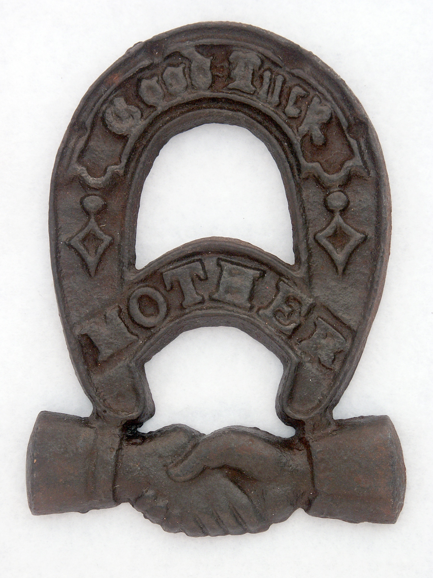 Good Luck Mother ~ cast iron, 5 3/8″ x 3 7/8ā without feet. On face: GOOD LUCK MOTHER. On reverse: D 93 and the letters JMC. Cast through the top as evidenced by a gate mark. This horseshoe plaque trivet dates to the late 1800s and would have been given as a gift, perhaps at a fraternal lodge ceremony or dinner.