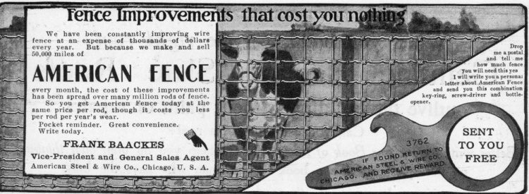In 1901, U.S. Steel Corporation purchased the American Steel and Wire Company and operated it as one of its subsidiaries. This 5 1/2″ x 2″ ad appeared in a 1906 magazine; click to enlarge.