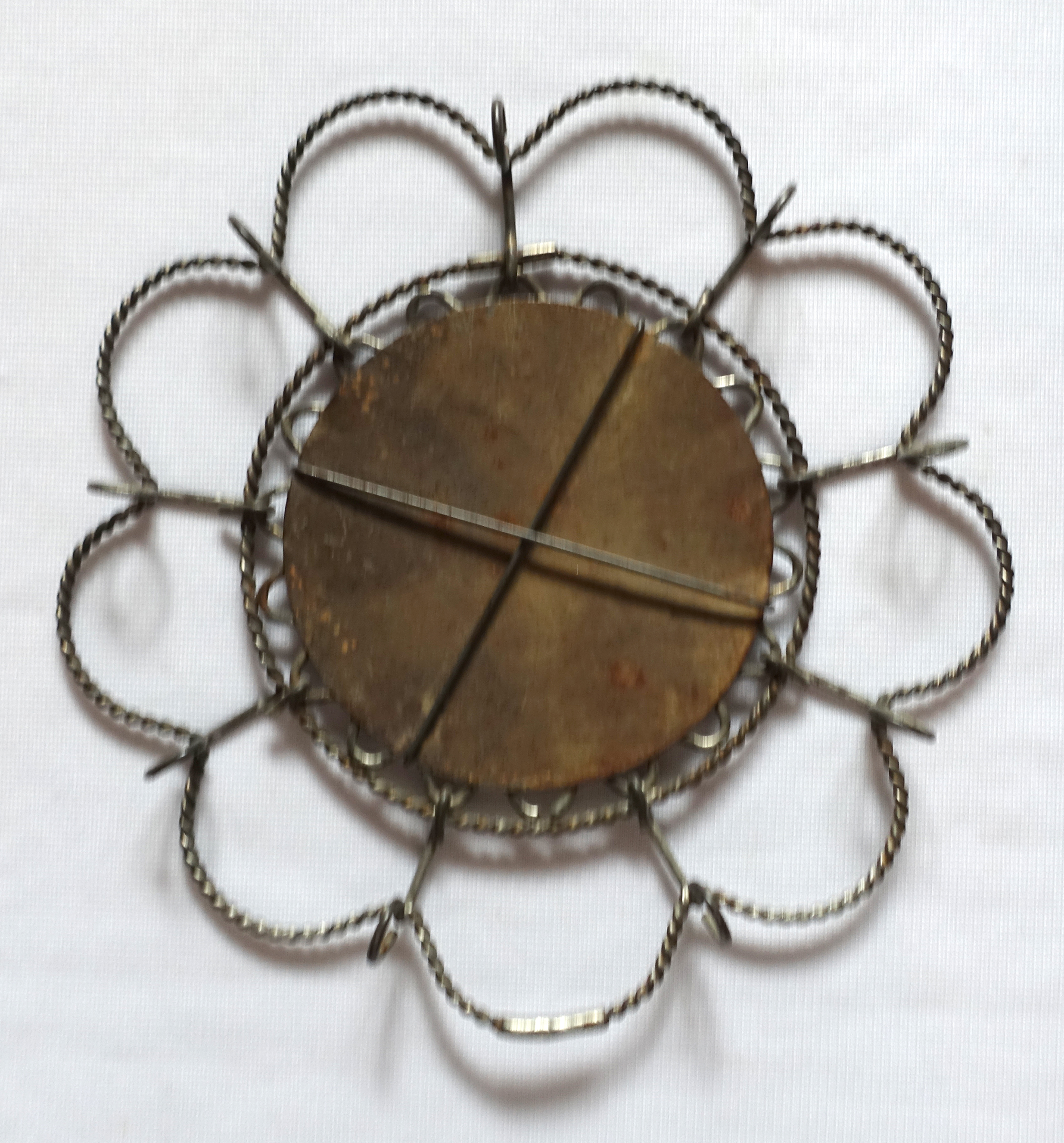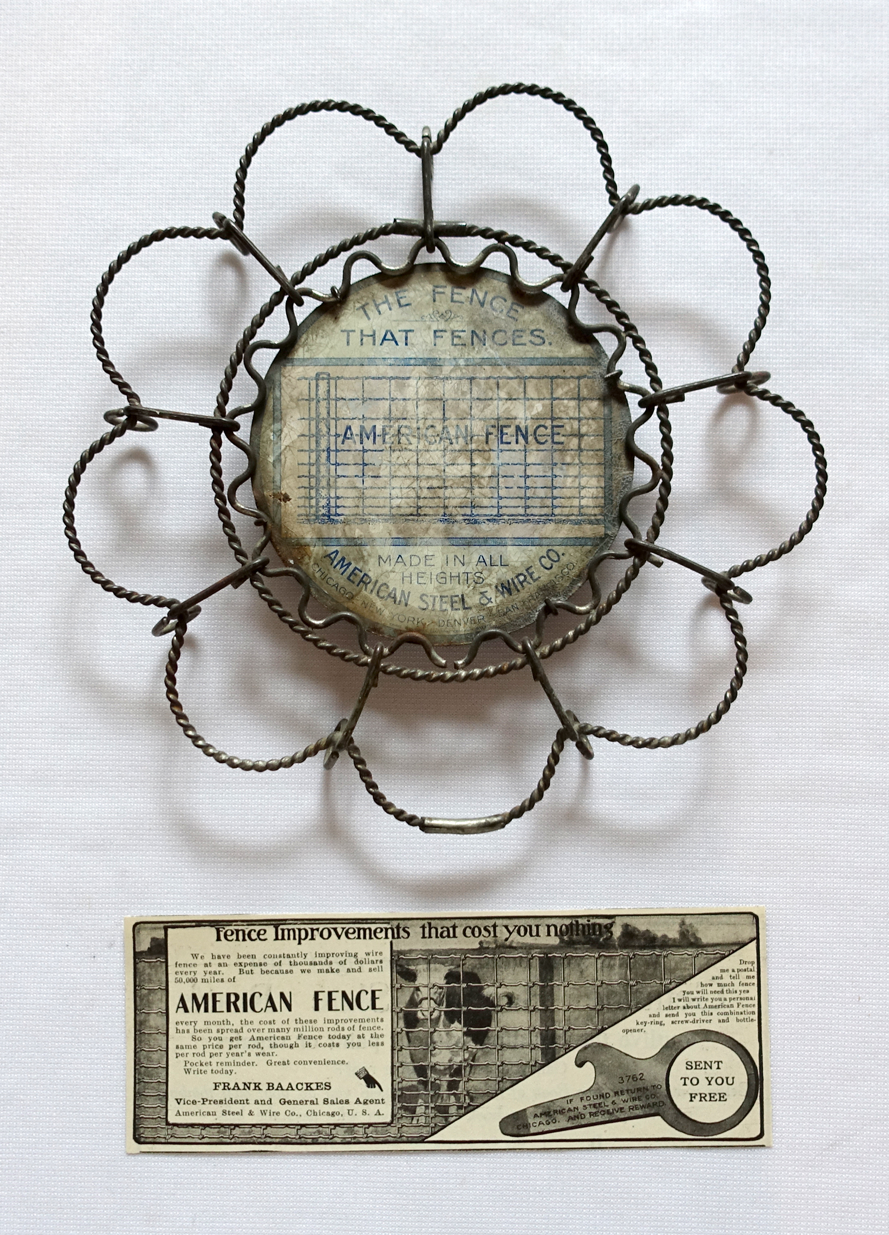 This interesting trivet, circa 1910, advertised American Fence’s line of barbed wire. It’s 6 1/2″ in diameter with a tinned lithograph insert that reads: