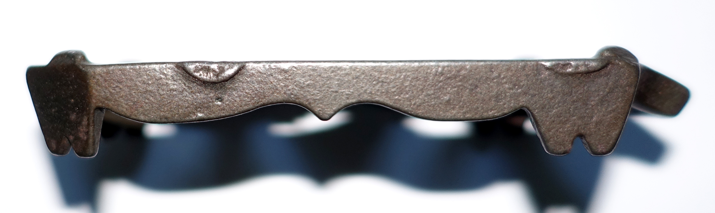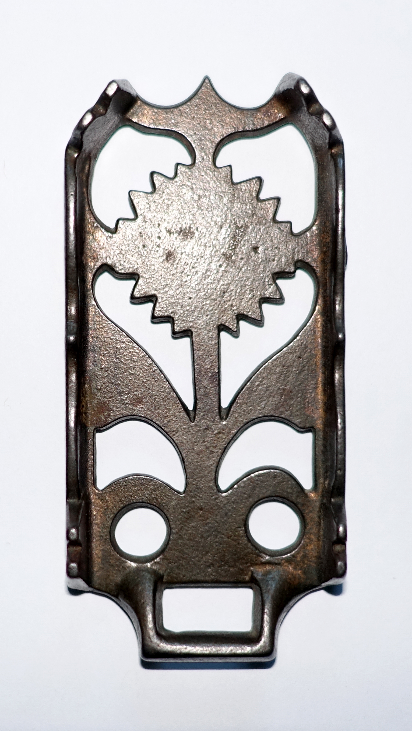 Below are three different views of the trivet. There are 4 small iron guides at the top edges to contain the little sadiron. Note also the 2 gate marks (casting marks) along one side. There is no signature on the reverse.