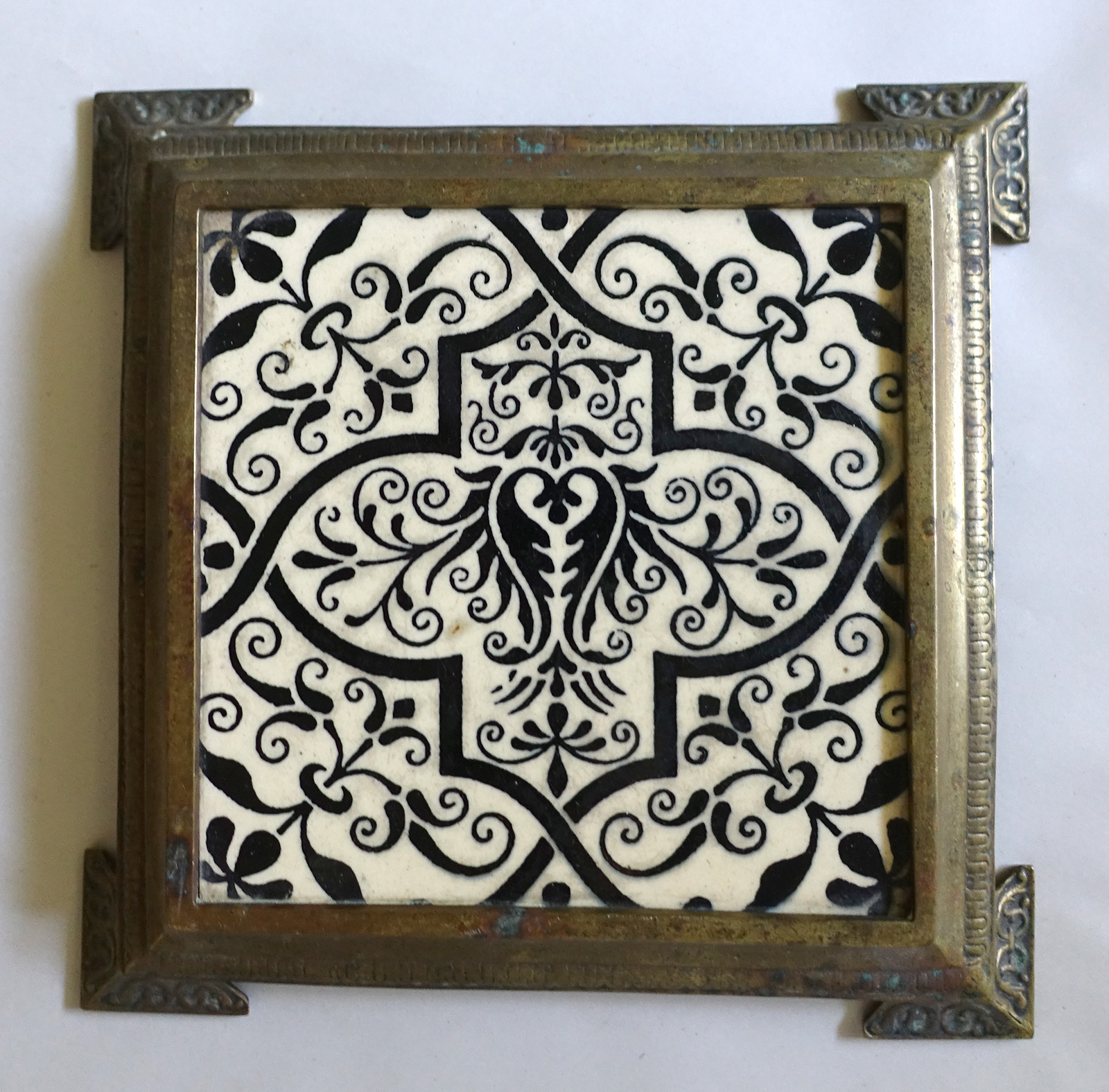 The 8 1/2″ square brass trivet frame is unpolished with original patina; I never attempted to remove the tile from the frame for cleaning. Note the ornamental feet. The 6″ square Minton tile is in excellent condition with only minimal crazing. On the reverse are the raised letters: