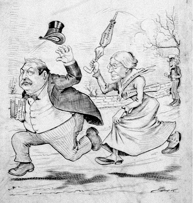 President Cleveland was no supporter of the women’s suffrage (right to vote) campaign, stating “Sensible and responsible women do not want to vote. The relative positions to be assumed by man and woman in the working out of our civilization were assigned long ago by a higher intelligence than ours.” This cartoon, published in the Minneapolis Journal on April 26, 1905, depicts Cleveland being chased by leading suffragette Susan B. Anthony. He’s holding a book titled “What I Know About Women’s Clubs” while she’s brandishing a “Women’s Suffrage” umbrella; and yes, that’s Uncle Sam in the background.