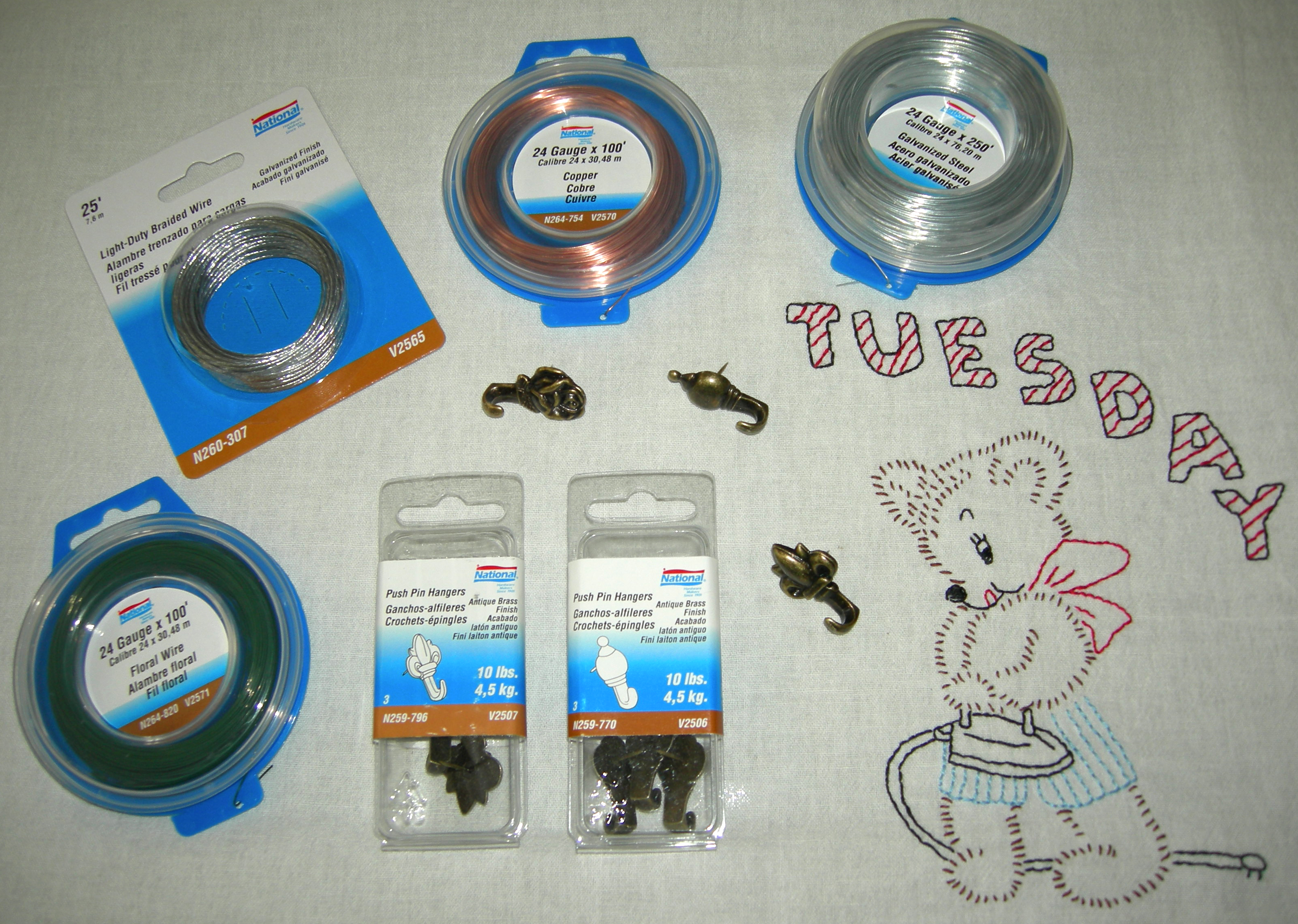 To fashion a hanging hook on the reverse of each trivet I use either light duty steel braided wire or (my preference) a doubled strand of 24 gauge wire available in: