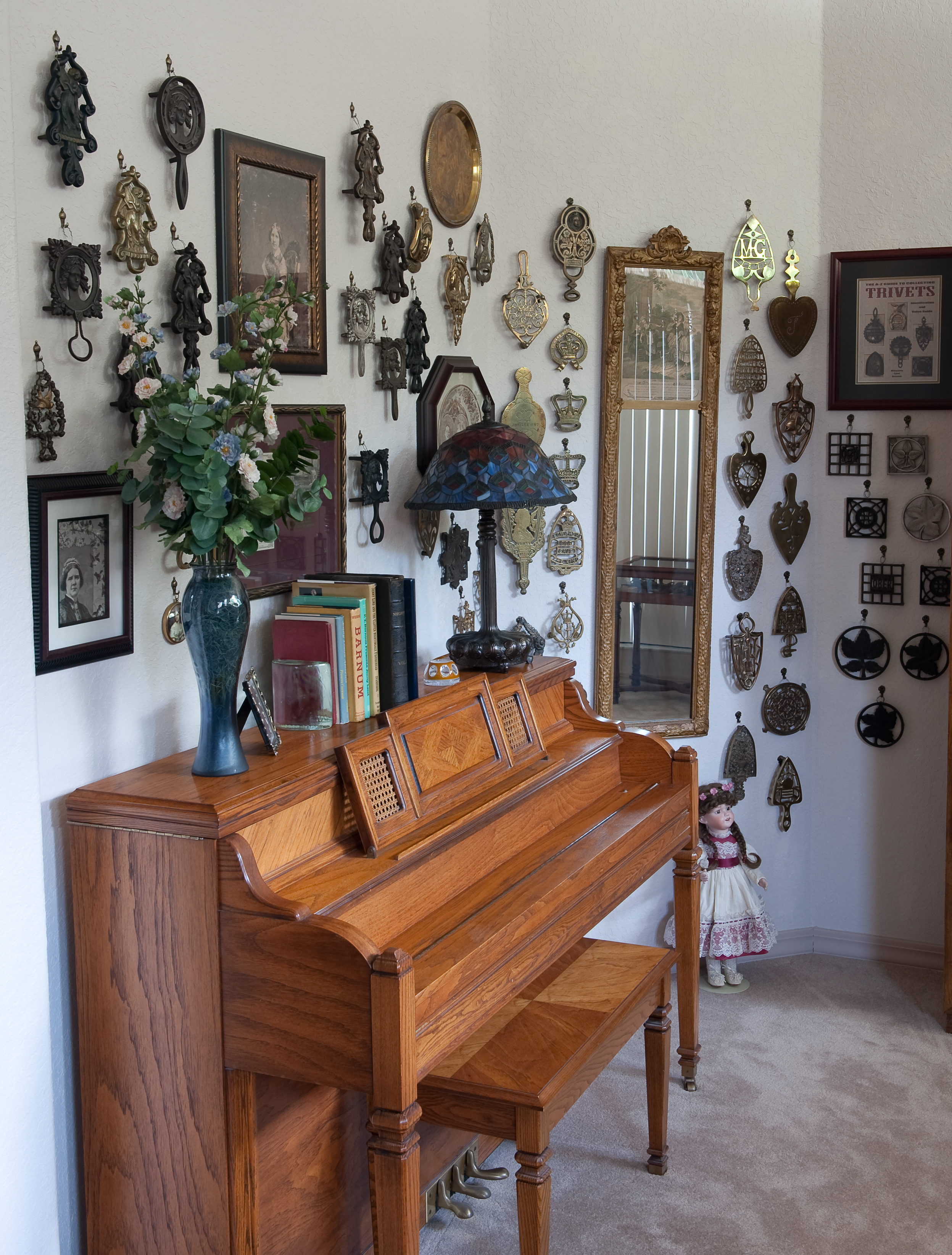 My favorite places to display trivets are the kitchen, dining room, and family room ~ areas where they can be viewed and enjoyed on a daily basis. And best of all, they’re easily accessible to take down when doing further research … or to share with a guest. A collection of Jenny Lind trivets (below) seems especially appropriate to display over a piano.