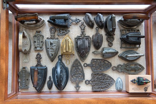 A 23 x 15″ curio table showcases a collection of little irons and trivets.
