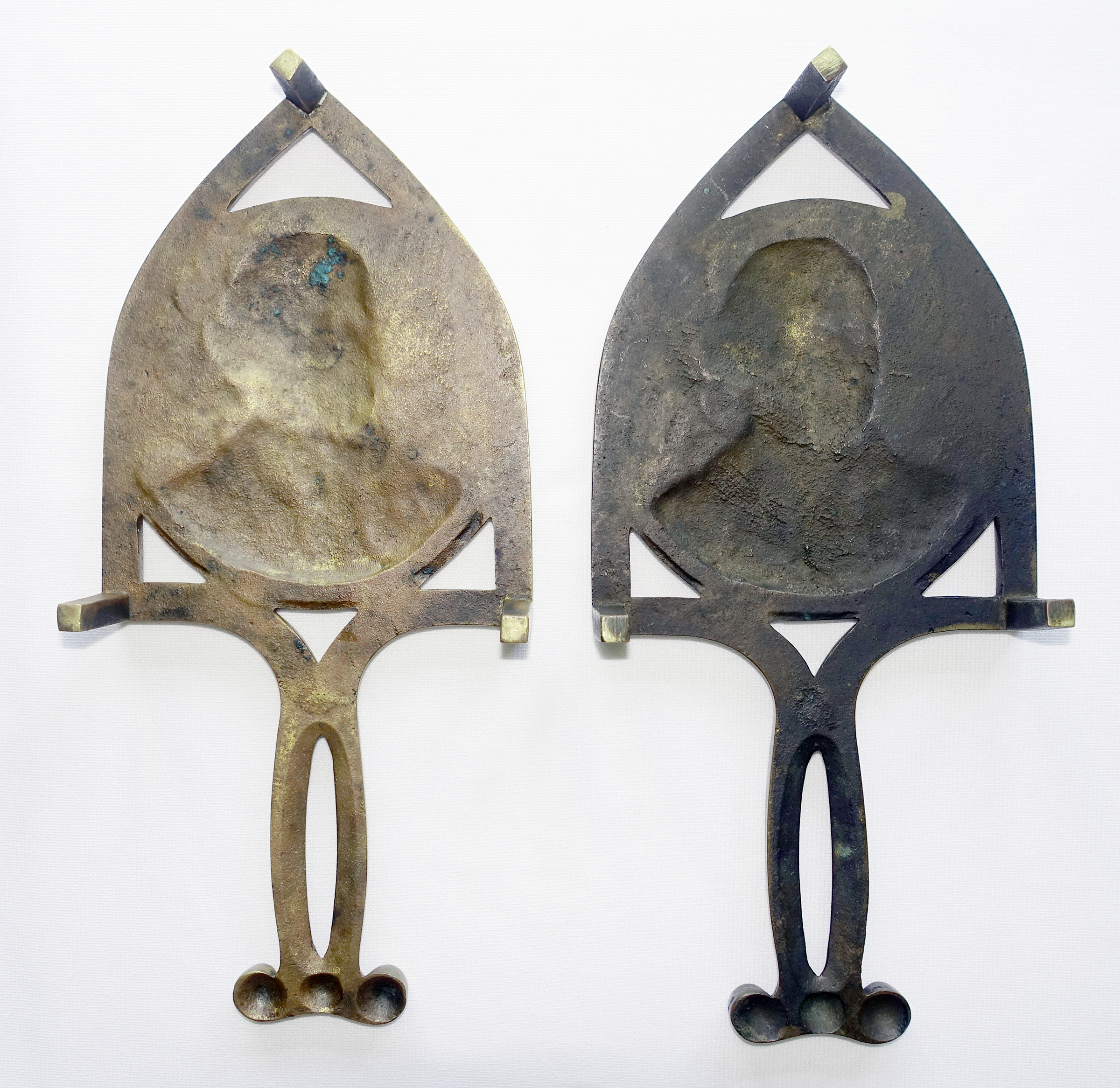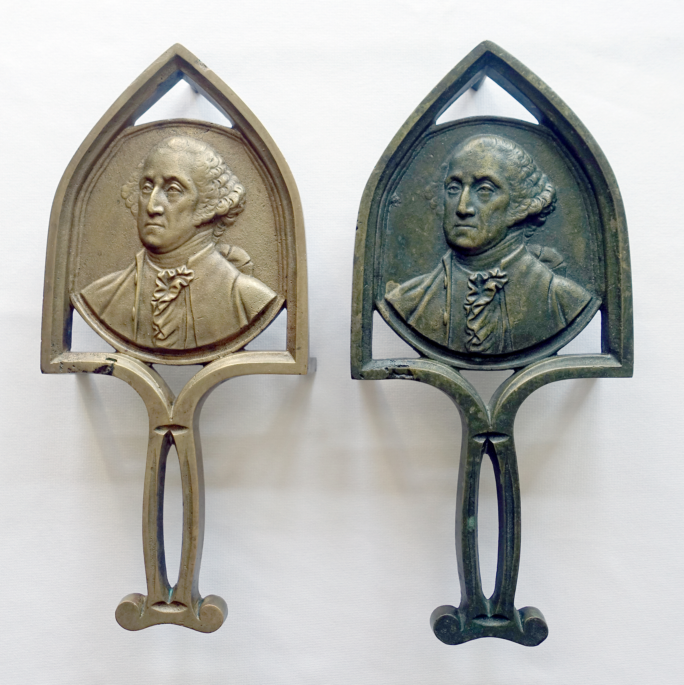It’s unknown how many of those trivets were produced or still exist. So I was very surprised when, in June 2017, this pair of identical brass trivets was presented on LiveAuctioneers by B. S. Slosberg Inc. Auctioneers of Philadelphia. Listed as a single lot, one image was provided along with the following description: “Pr Bronze George Washington Trivets, features cast relief portraits of George Washington in Cathedral style frames with open work handles, 19th C., 9 5/8″ x 4 1/2″ x 1 3/4″. Condition: Very good, no issues identified.”