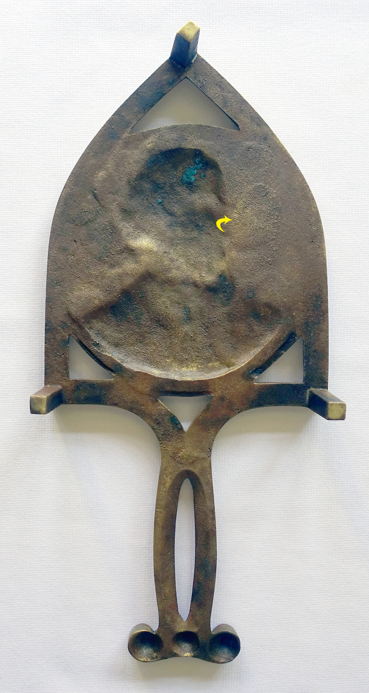 Notice the round sprue (casting) mark on the reverse of each trivet, where the handle meets the stand. And, just as I had hoped, each trivet exhibits that wonderful wavy, putty-like appearance suggesting a sculpted wax or clay mold. And could that possibly be a molder’s fingerprint I see on one of my trivets? Double click on the image below, then look to the right, next to the yellow arrow. It’s the size and shape of a fingertip!