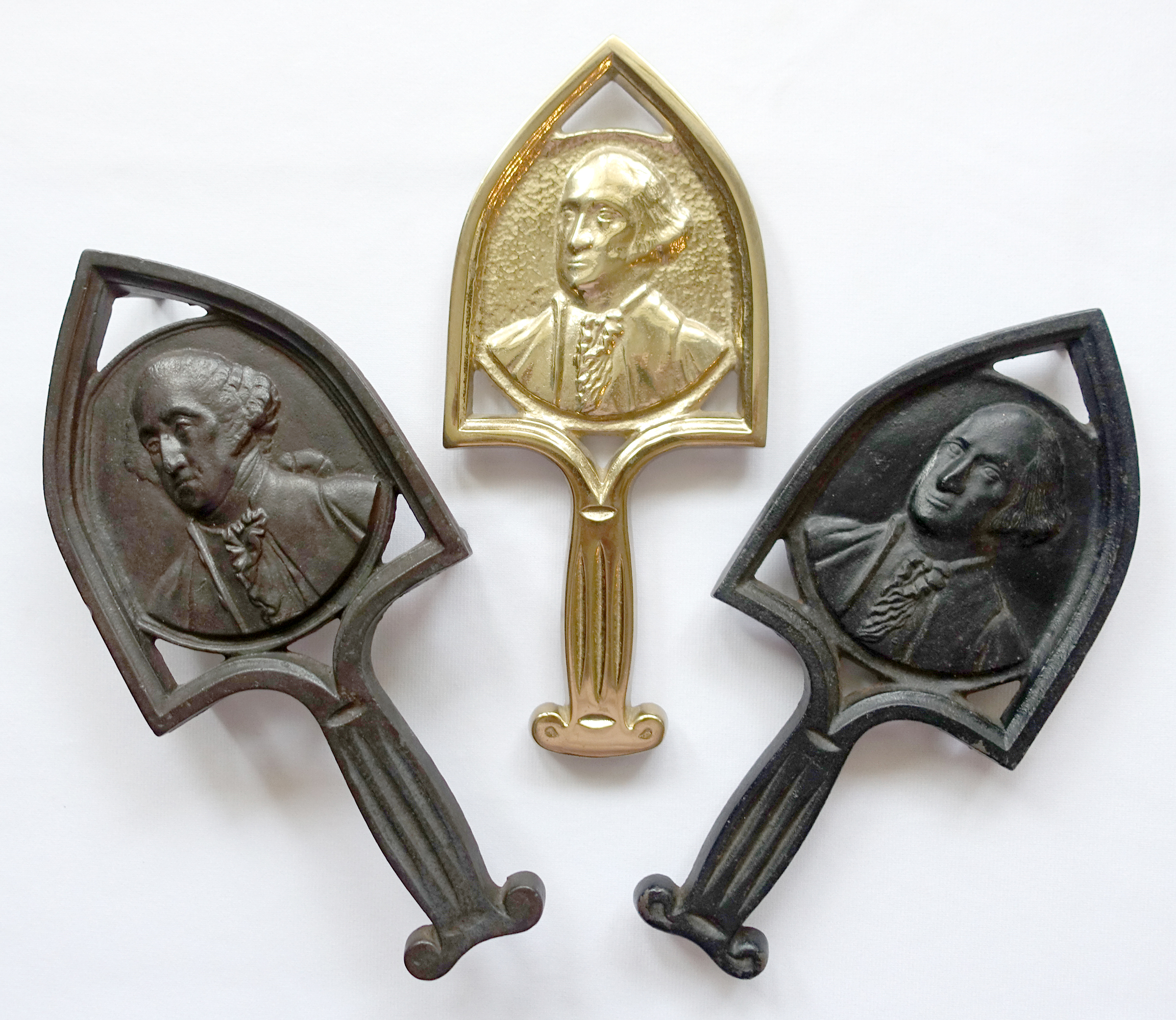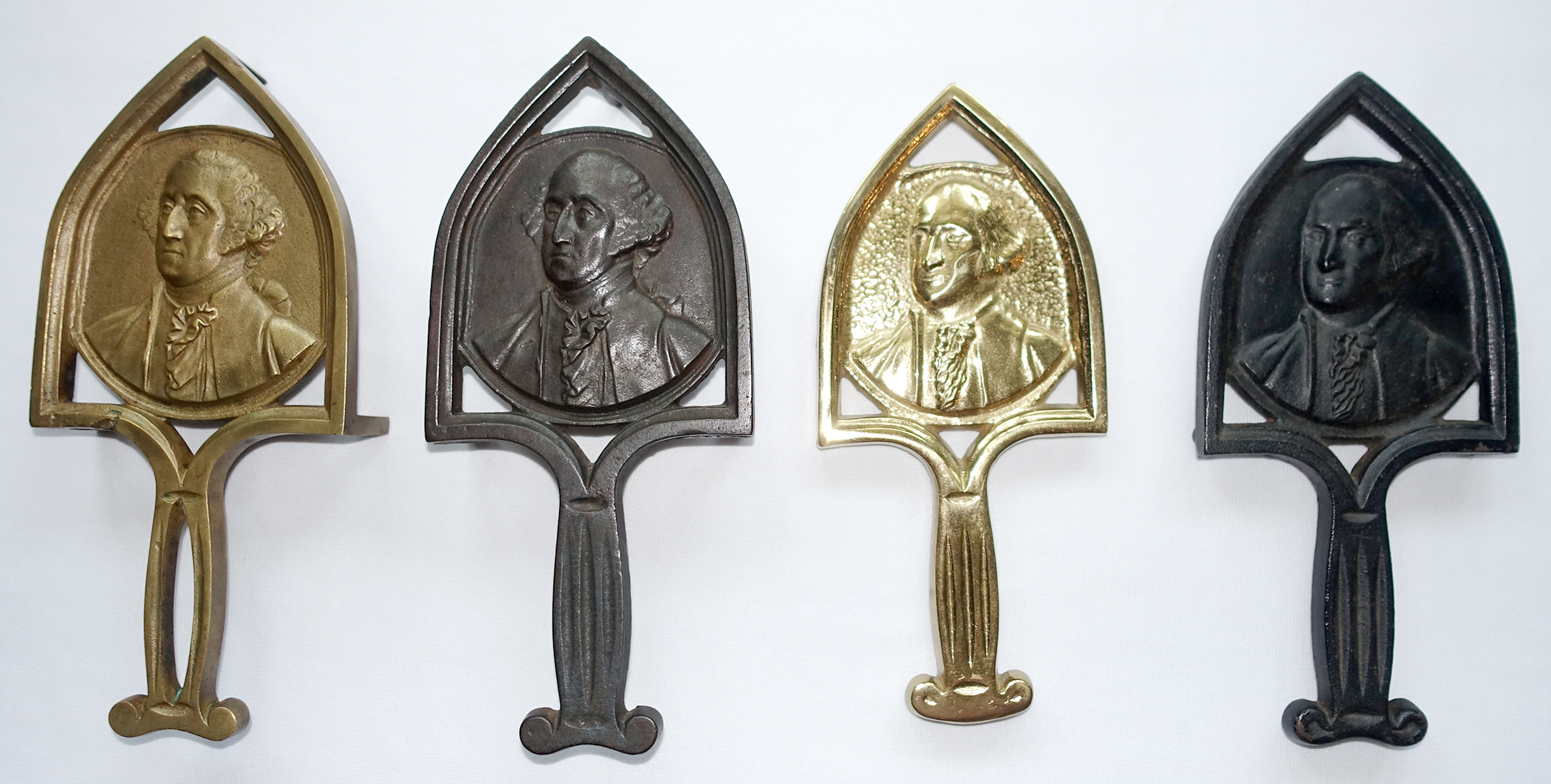 QUALITY OF DETAIL: Note how much more intricately detailed the original and antique designs are compared to the two mass produced contemporary trivets. Note also what looks like a pigtail, hair bow, or silk hair bag visible over George Washington’s shoulder on the two older castings. Contemporary reproductions often don’t include this detail.