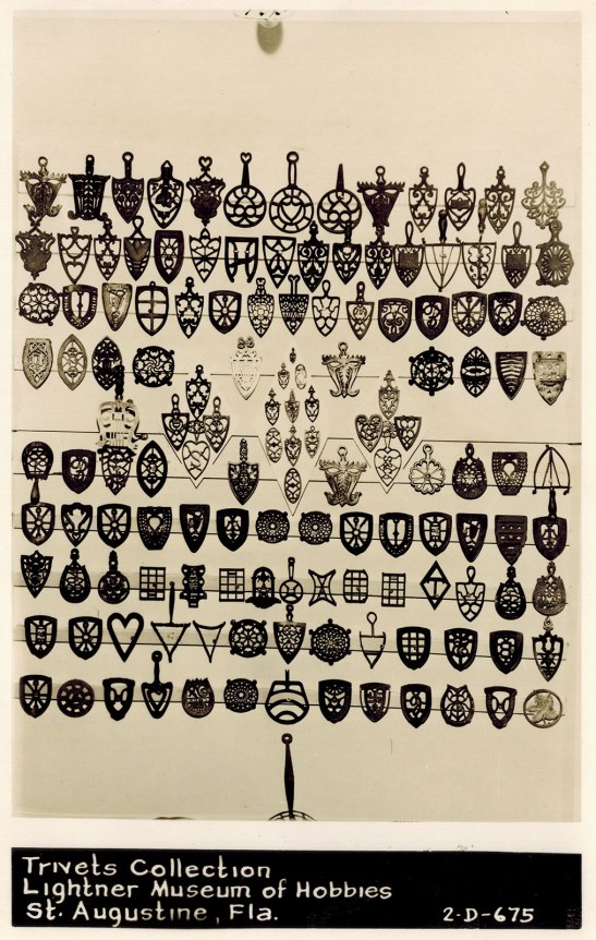 Trivets Collection at the Lightner Museum of Hobbies, St. Augustine, Florida ~ The Lightner Museum opened in 1948 and is still open to the public today. I’ve visited the museum several times but have never seen any trivets on display. Several emails to the curator have gone unanswered … could their trivets be in storage?