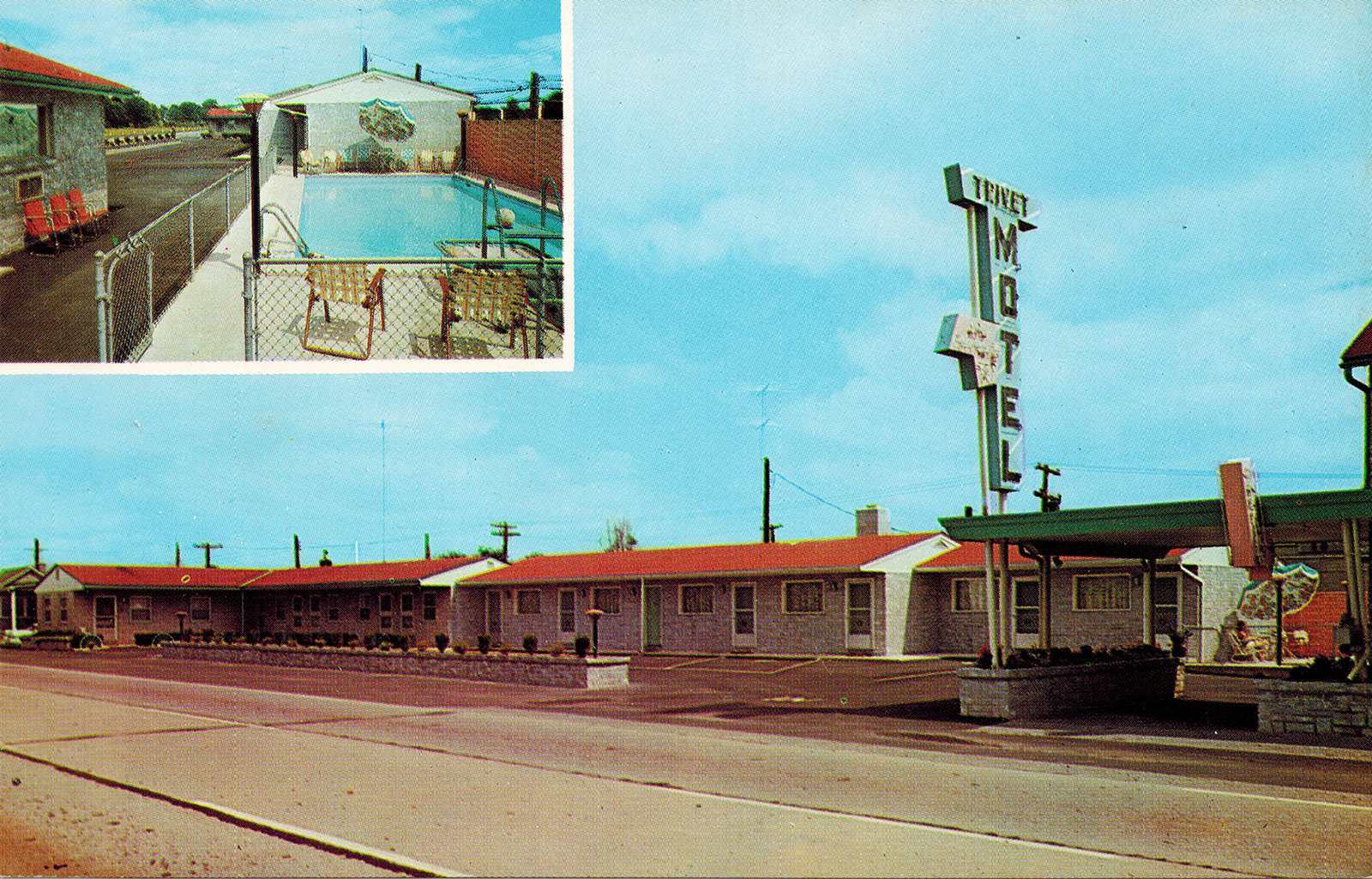 Trivet Motel, 1524 E. Cumberland St., Lebanon, Pennsylvania ~ They advertised a swimming pool, private ceramic tile baths, wall-to-wall carpet, free T.V. and “Air-Conditioning”. (I wonder why that was in quotes?) Google Street View reveals it’s now a Relax Inn.