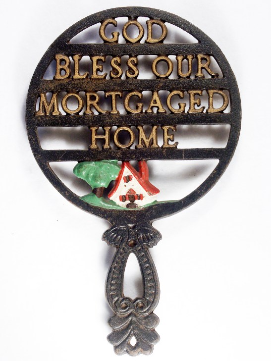 Motto trivets, dating from the 1950s, are the most whimsical of collectible trivets. The sayings are familiar, reminiscent of a time when the kitchen was the heart of the home and a mortgaged home was the American dream. Most of these trivets were accent painted with enamels but you may find some in a flat black finish. Companies that produced cast iron motto trivets included JZH, Wilton, John Wright, Iron Art, and Cross Publishing Company.