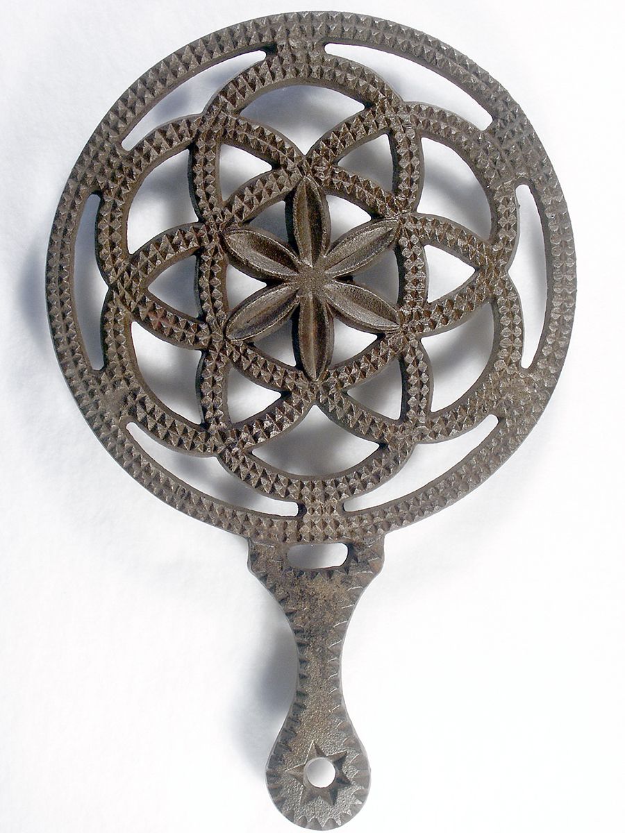 JZH 1945 F, Version #1 w/handle. 10 1/4 x 6 5/8″. Scarcest alphabet trivet.