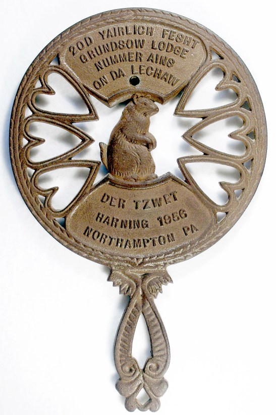 The Foundry also designed and made 900 special trivets for the “Grundsow” (Groundhog) Lodge No. 1 on the Lehigh River at Northampton, Pennsylvania, February 2, 1956. This trivet has a groundhog in the center, flanked by a trio of hearts, and the handle is decorated.