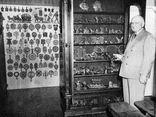 In my last blog post I introduced John Zimmerman Harner (1872-1965) and his JZH Alphabet Series trivets. The 1950s era photo above shows John Harner in the basement of his Boyertown, Pennsylvania home at 600 Highland Avenue. There he maintained his personal collection of JZH trivet castings ~ as well as many other Early American antiques and collectibles.