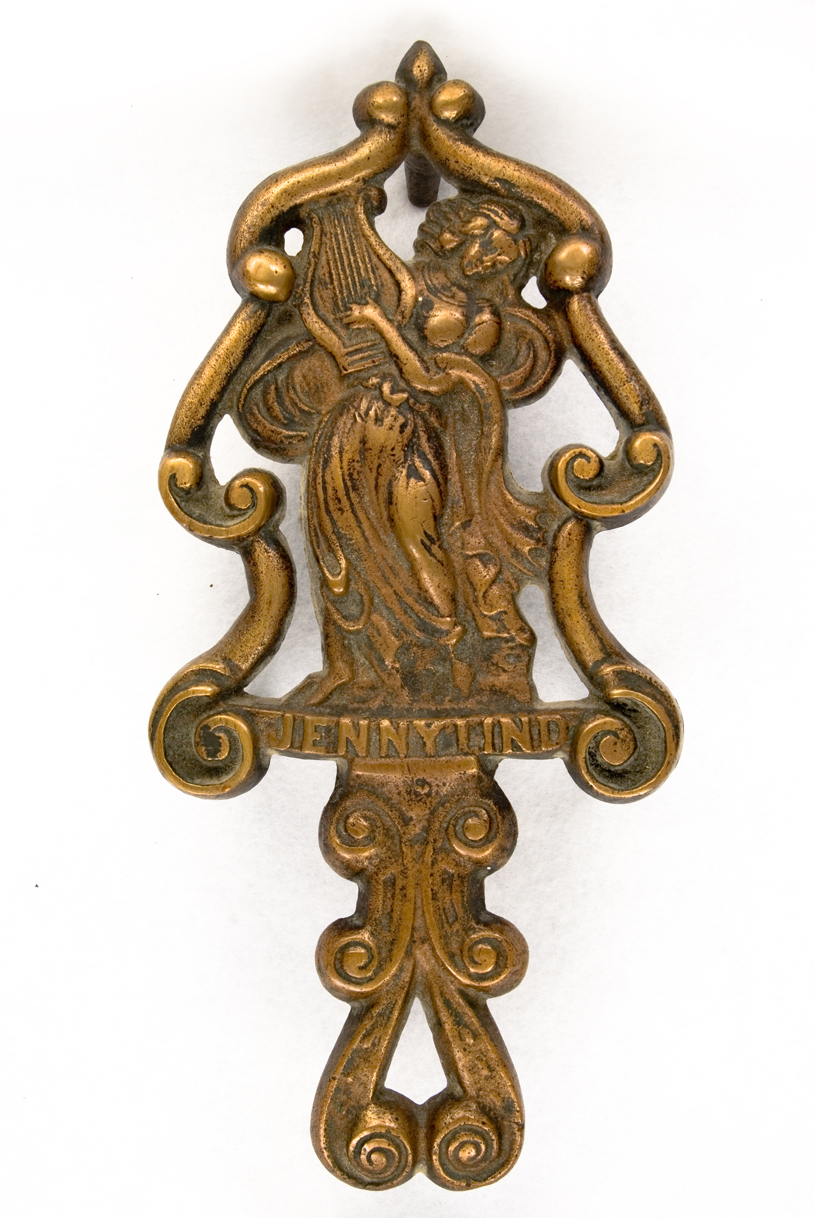 Jenny Lind Euterpe w/Three Swirl Handle. Bronze, 10 1/8 x 4 3/4” w/three 2” legs. Gate mark along edge; backcoping to center of figure. On face: JENNY LIND. Lovely patina. This design is less common in bronze. Circa late 1800s.