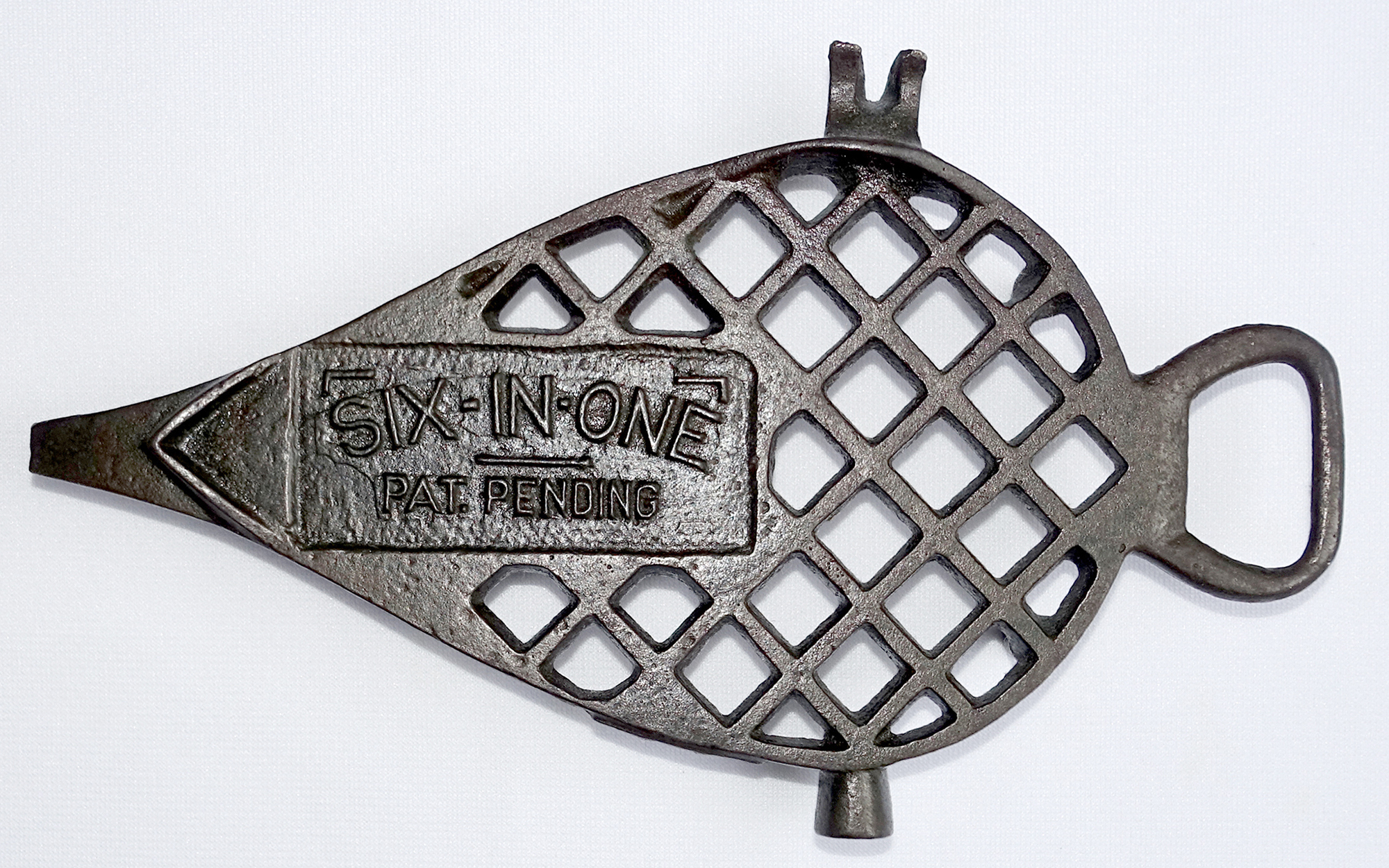 8a. Six In One tool, Version #1. On front: SIX-IN-ONE PAT. PENDING. Cast iron, measuring 7 1/4″ x 4 3/8″ with two 3/8″ feet.