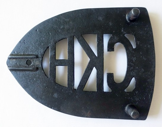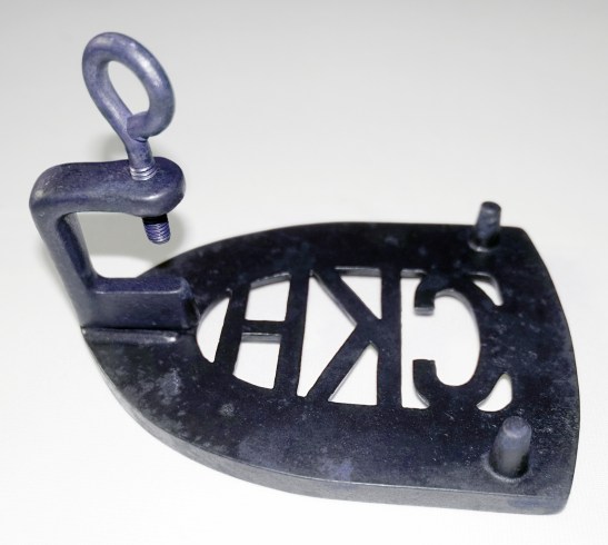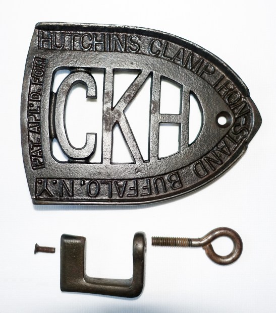 This adjustable sad iron stand would have attached to an ironing board or table top, providing a convenient place to rest a hot iron. In the center are the letters CKH for the C. K. Hutchins Company. Around the edge it reads HUTCHINS CLAMP IRON-STAND, BUFFALO, N.Y. and PAT APPL’D FOR. There are no numbers or letters on the reverse.