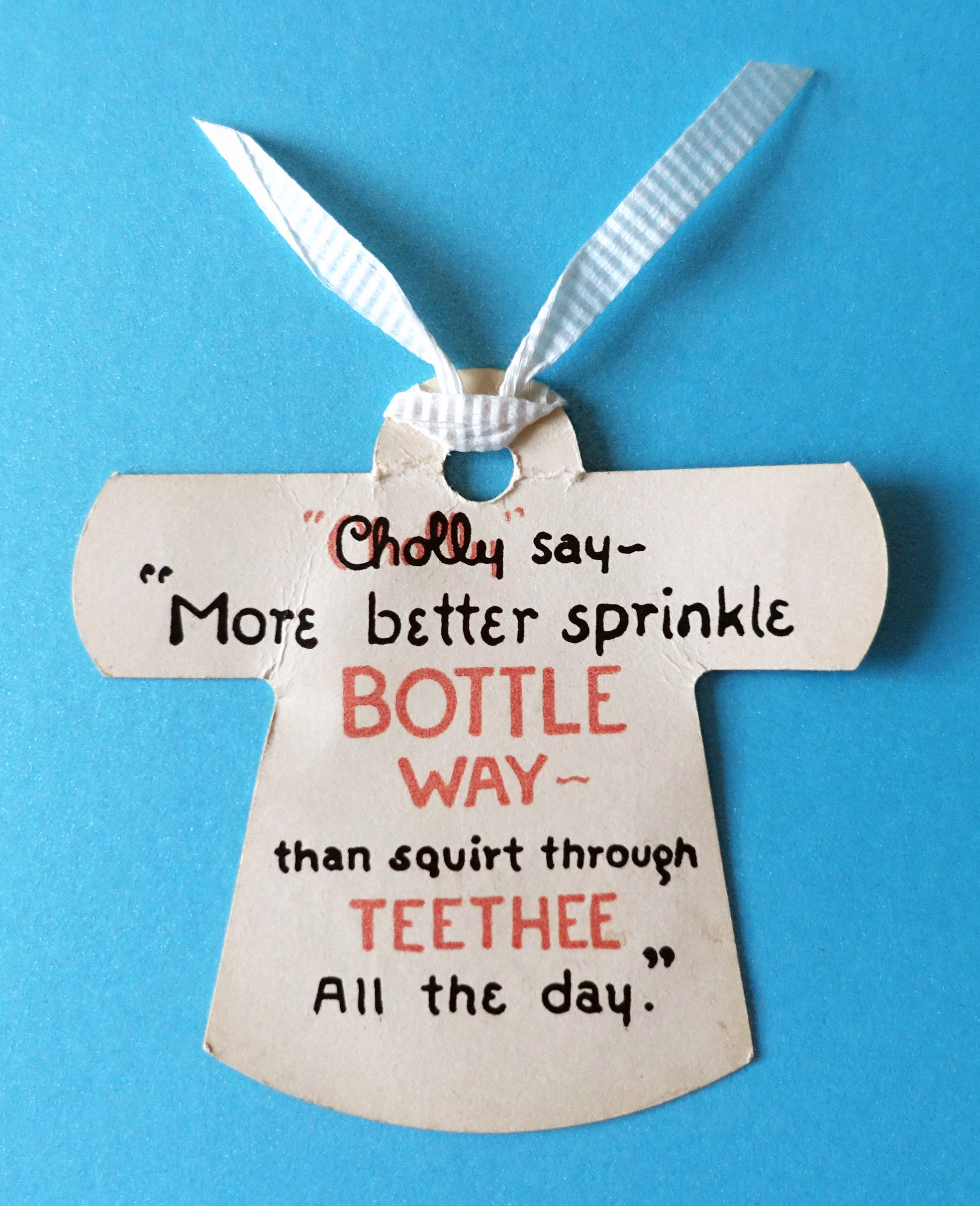 Reverse of the “Cholly” hang tag. It refers to the obsolete way of spraying water from the mouth while ironing.