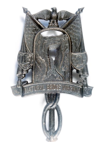 1953 Natural Bridge ~ CI, 7 x 4 1/2″ w/4 feet. On face: NATURAL BRIDGE, VIRGINIA. The initials HB are on the far right corner of the scroll. On reverse: COPYRIGHT 1953 VA. METALCRAFTERS 9-37 and the VM/Betty Lamp logo.