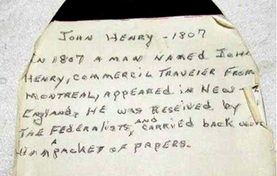 Of interest are two notes that provide a basis for researching this trivet. The first note was originally taped to the back of the trivet but removed for the auction photos. “John Henry – 1807. In 1807 a man named John Henry, commercil (sic) traveler from Montreal, appeared in New England. he was reseived (sic) by The Federalists and carried back with him a packet of papers.”