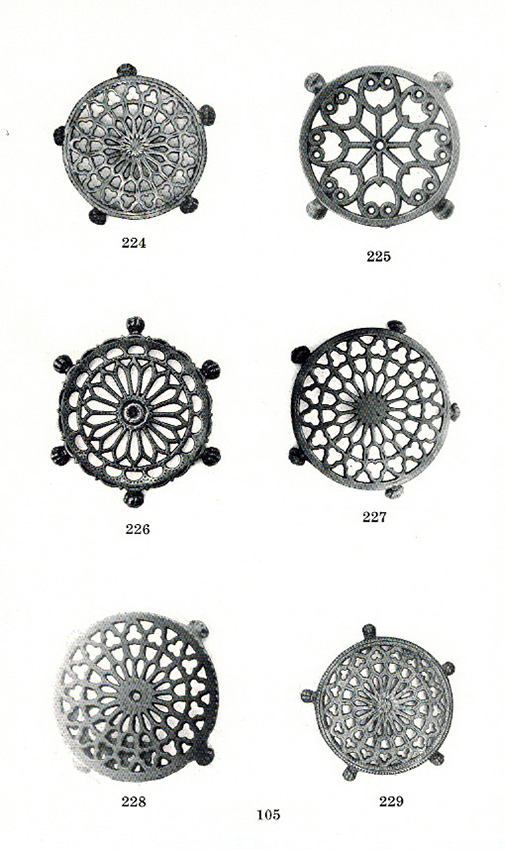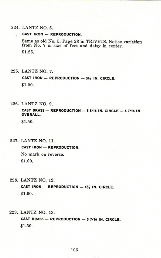 Dick Hankenson identified these six Lantz trivets as being reproduced in his 1972 book Trivets: Old And Reproductions, Book 2 on pages 105-106. How can you differentiate between old and repro? Observe the quality of the casting; check closely for casting marks; and measure for size (reproductions will most likely be one size smaller), comparing measurements with a published reference.