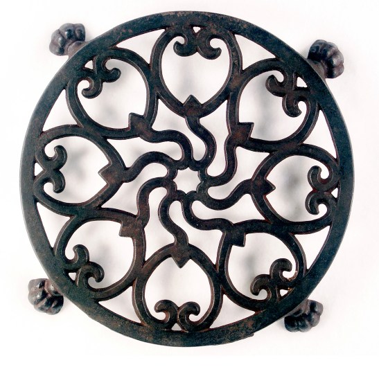 Lantz trivets are among my favorite trivets! So delicately cast, they’re a testament to fine metalwork. Collectors identify Lantz trivets by the intricacy of their circular design, a size of 6” or less in diameter, and their paw feet. A few other circular trivets of a similar size, but with pad feet, have been grandfathered into this definition. Store catalogs of the mid to late 1800s offered them for sale, listed as Coffee or Tea Stands.