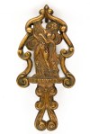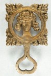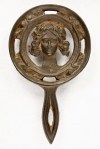 Jenny Lind Euterpe Rocaille Spade ~ Brass, 7 1/4″ x 4 1/2” w/three 1 1/8” legs. Sprue mark on reverse above handle; backcoping to center of figure. On face: JENNY LIND. Being cast of brass adds to its value.