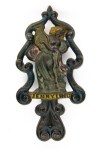 Jenny Lind Euterpe w/Three Swirl Handle ~ Cast iron, 9 3/4″ x 4 1/2” w/three 1 5/8” legs that were attached in a separate process after the initial casting. Two gate marks along edge; backcoping to center of figure. On face: JENNY LIND