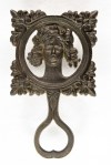 Jenny Lind Euterpe w/Three Swirl Handle ~ Bronze, 10 1/8″ x 4 3/4” w/three 2” legs. Gate mark along edge; backcoping to center of figure. On face: JENNY LIND. This is a gorgeous casting with a lovely patina. This design is less common in bronze.