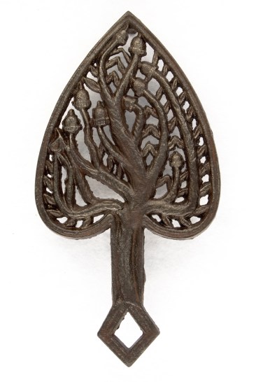 Rimby Oak Tree and Acorn ~ cast iron, 8 x 4 1/8” w/three 1 1/8” legs and sprue mark on reverse. W. R. signature (for William Rimby of Baltimore, MD) on handle reverse.