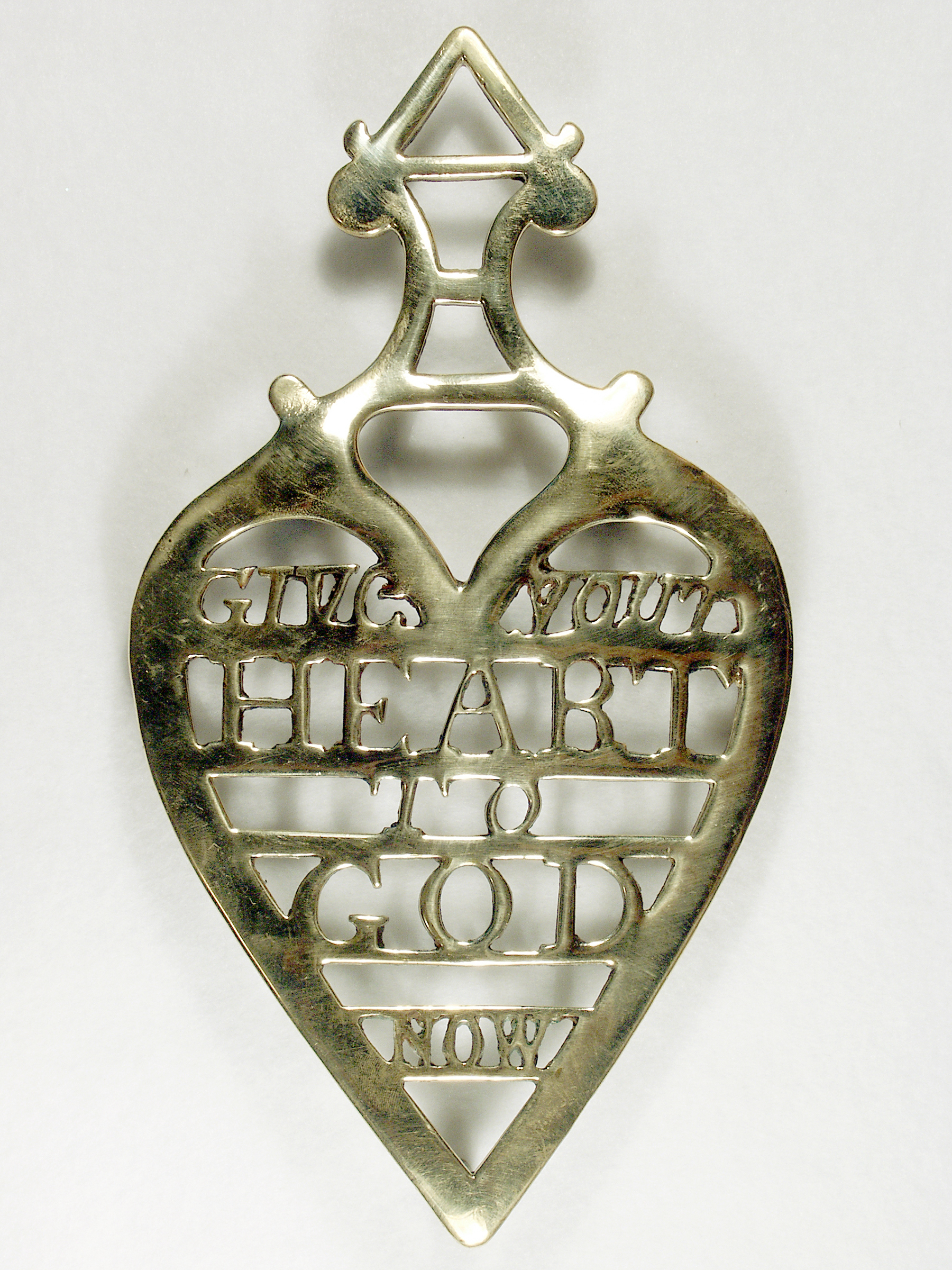 Give Your Heart ~ brass, 9 1/2 x 5 1/4″ w/three 7/8″ feet. On face: GIVE YOUR HEART TO GOD NOW. Slight waviness to surface, slight tilt to legs as expected w/age.