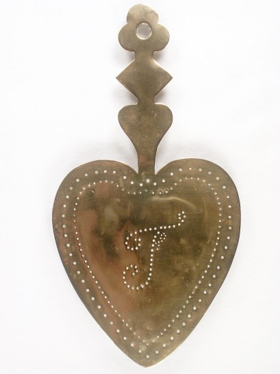 “T” ~ hand cut brass, 11 5/8 x 6″ w/ three 3/4″ tooled feet. On face: the letter “T” and a double row of dots in decorative punch-work around the heart.