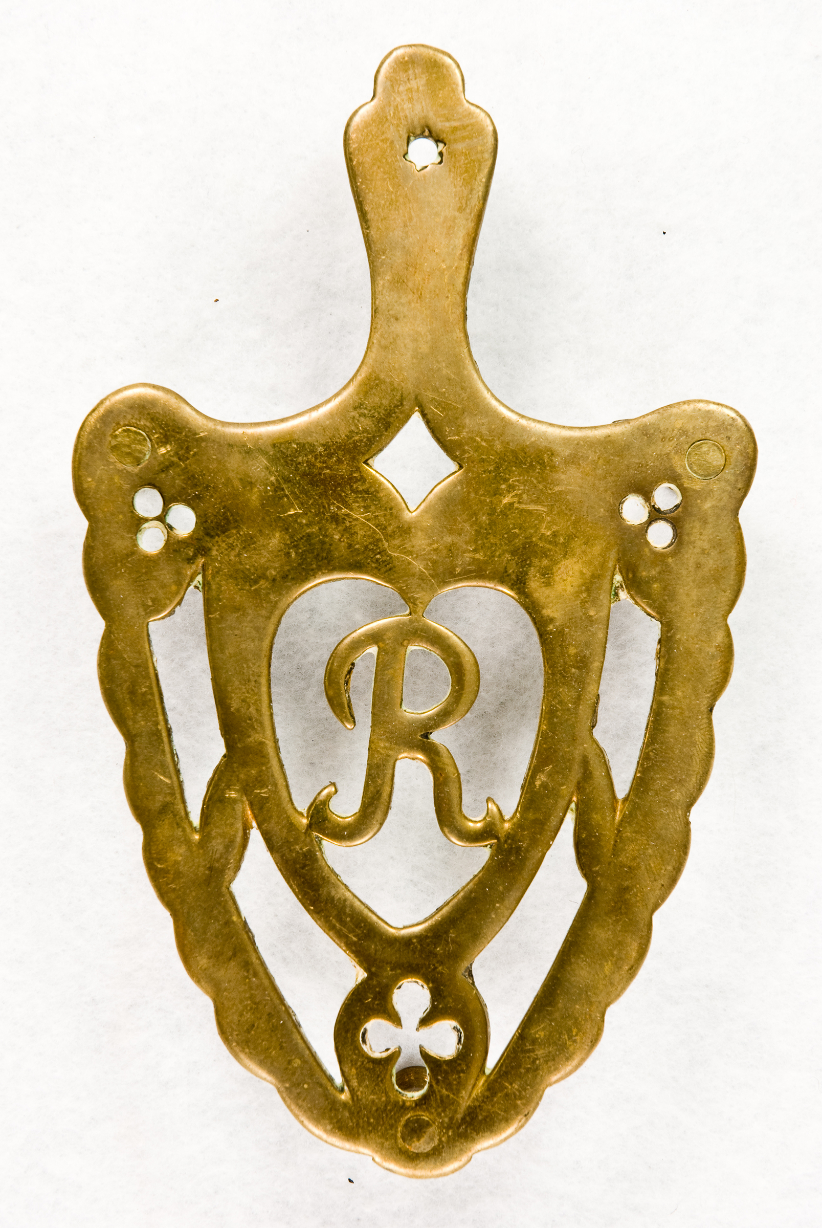 “R” ~ brass, 5 5/8 x 3 3/8” w/three tooled legs. On face: R in a heart.