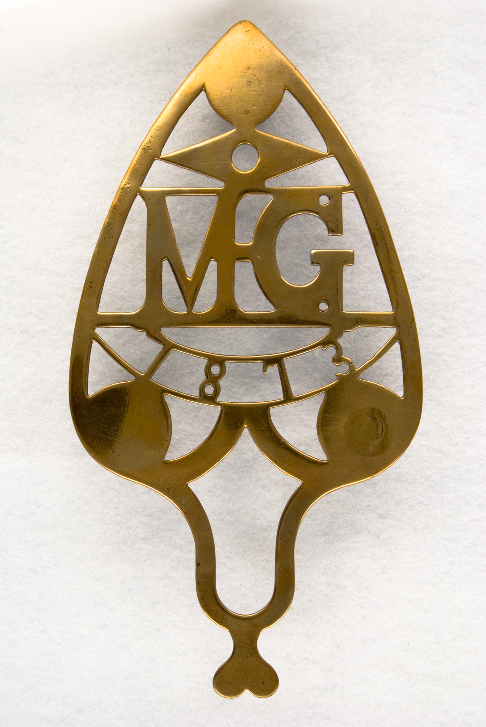 MG 1873 ~ Hand Cut Brass, 10 1/4 x 5 3/8″ w/three 1 1/8″ ornamental legs with ball feet. On face: MG and 1873 within a heart shaped border.