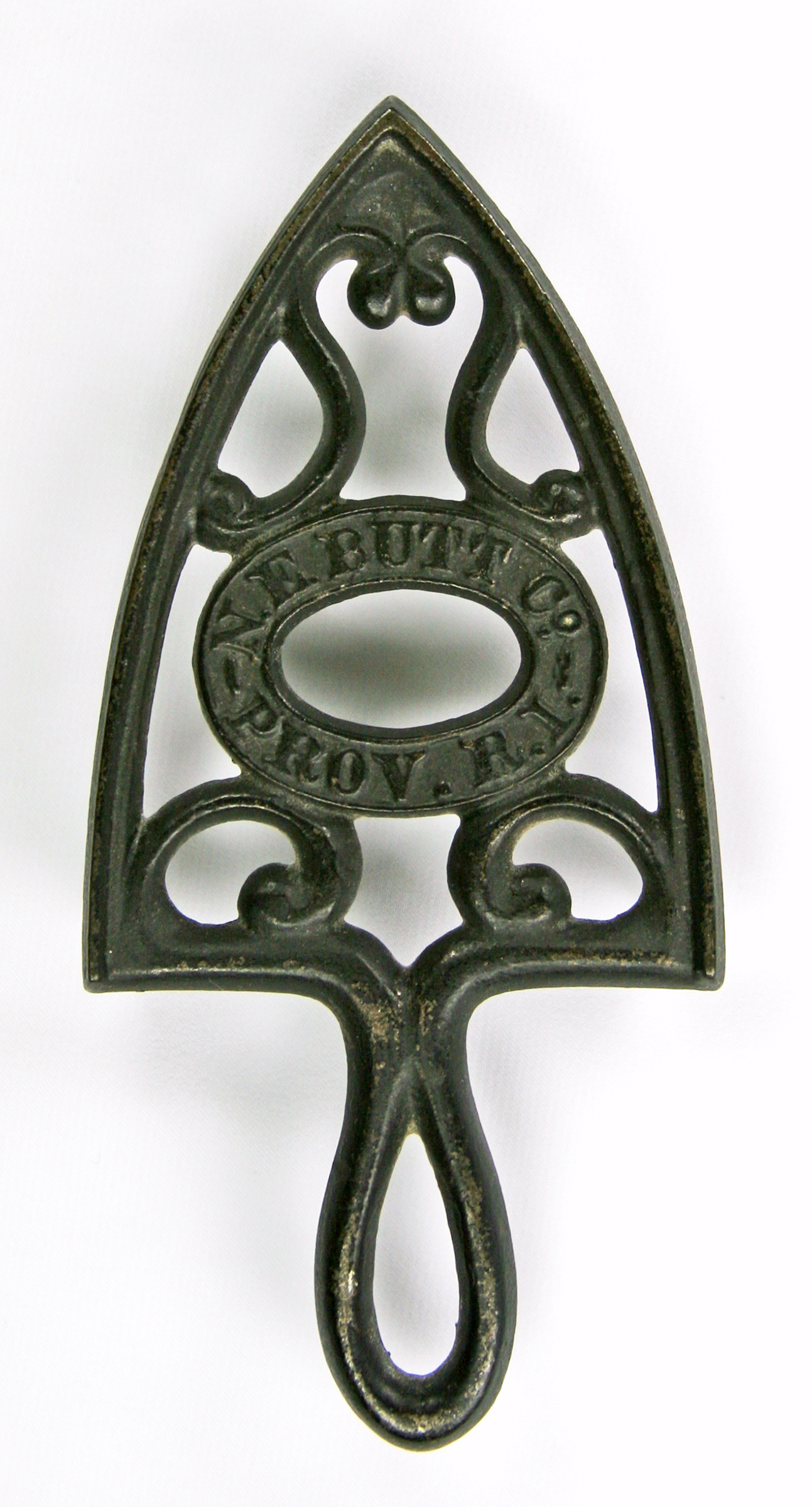 N.E. BUTT CO. PROV. R.I. – Cast iron, toy sized trivet; 5 x 2 3/8″ w/three tiny feet. Double berry finial. RARE.