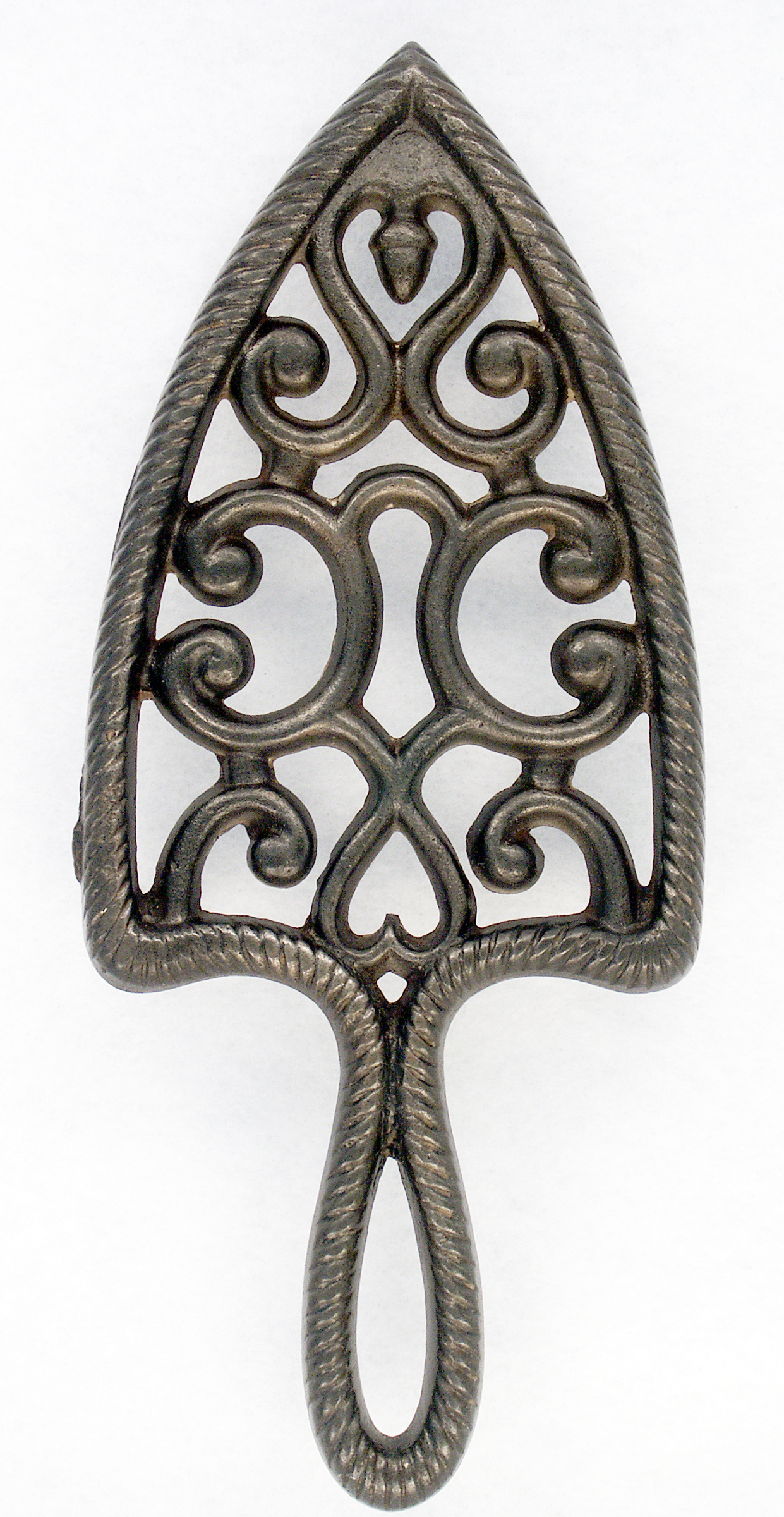 Plain Trivet – Cast iron, 9 x 3 3/8″ w/three 1 1/8″ legs. Gate marks along edge. This is the basic curlicue pattern without the panel.