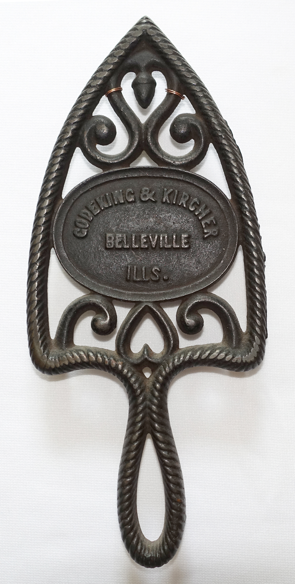 GODEKING & KIRCHER BELLEVILLE ILLS. – Cast iron panel trivet, 9 1/8 x 3 7/8″ w/three 1 1/4″ legs. Cast through the rim. RARE.