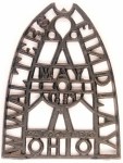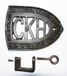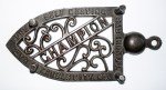 6. N. Y. Volunteer Firemens Association horseshoe plaque trivet, circa 1880s, signed DESIGN PAT APPL’D FOR BY C. J. HOAG on the reverse. To learn more about horseshoe plaque trivets, see my blog post Merry Christmas 1888 HP Trivet.