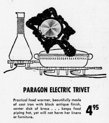 5. Trivet Hot Plate Patent 2,686,862 was assigned on August 17, 1954 to two men from Wisconsin: David Morrison of Two Rivers and Jurg A. Senn of Manitowoc, assignors to the Paragon Electric Company, Two Rivers, WI. “This invention relates to a trivet hot plate. In the past, trivets have been used solely for the support of previously heated vessels. Undue heating of the trivet and its handle will not occur.” The newspaper ad (above) for the Paragon Electric Trivet was published in 1954.