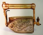 7. The Champion Stand is the companion piece to the Champion Self Heating Sad Iron; both are quite rare. Patent 445,927 was assigned to the self heating iron on February 3, 1891. As for the stand, it’s labeled PAT. PDNG. on the reverse. The 1990 reference Trivets and Stands, p. 216 states “Cup on handle for wax to keep iron from sticking.” For a second opinion, I asked pressing iron collector and author Dave Irons who replied “I think the small cup on the trivet is a drip catcher for the fuel line.” This sad iron stand is marked PAT. PDNG. on the reverse.