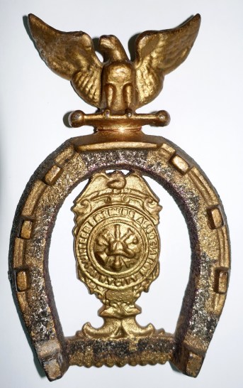 6a. Volunteer Firemens horseshoe plaque trivet. On face: VOLUNTEER FIREMENS ASSOCIATION NY CITY. Cast iron with gold wash and original glitter; circa 1880s.