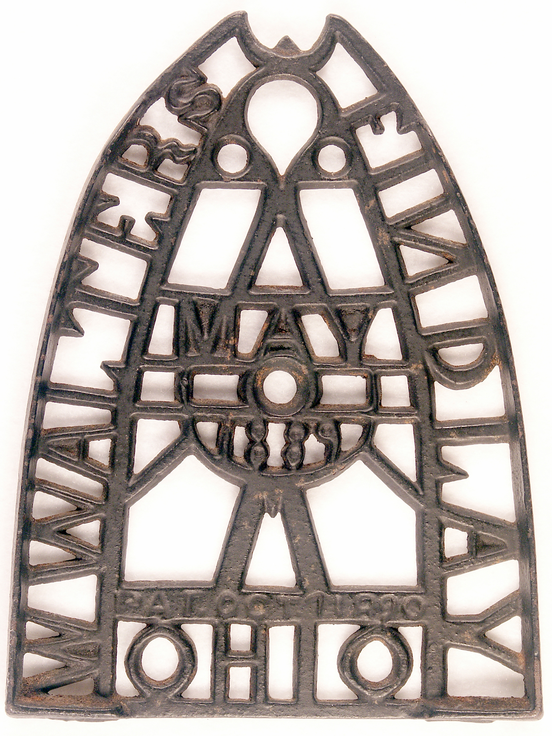 2e. W WALTERS FINDLAY OHIO MAY 1889. In smaller letters: PAT. OCT. 7 1890. Cast iron; note the fine detail. Measures 6 1/4″ x 4 5/8″ with three 1/8″ feet.