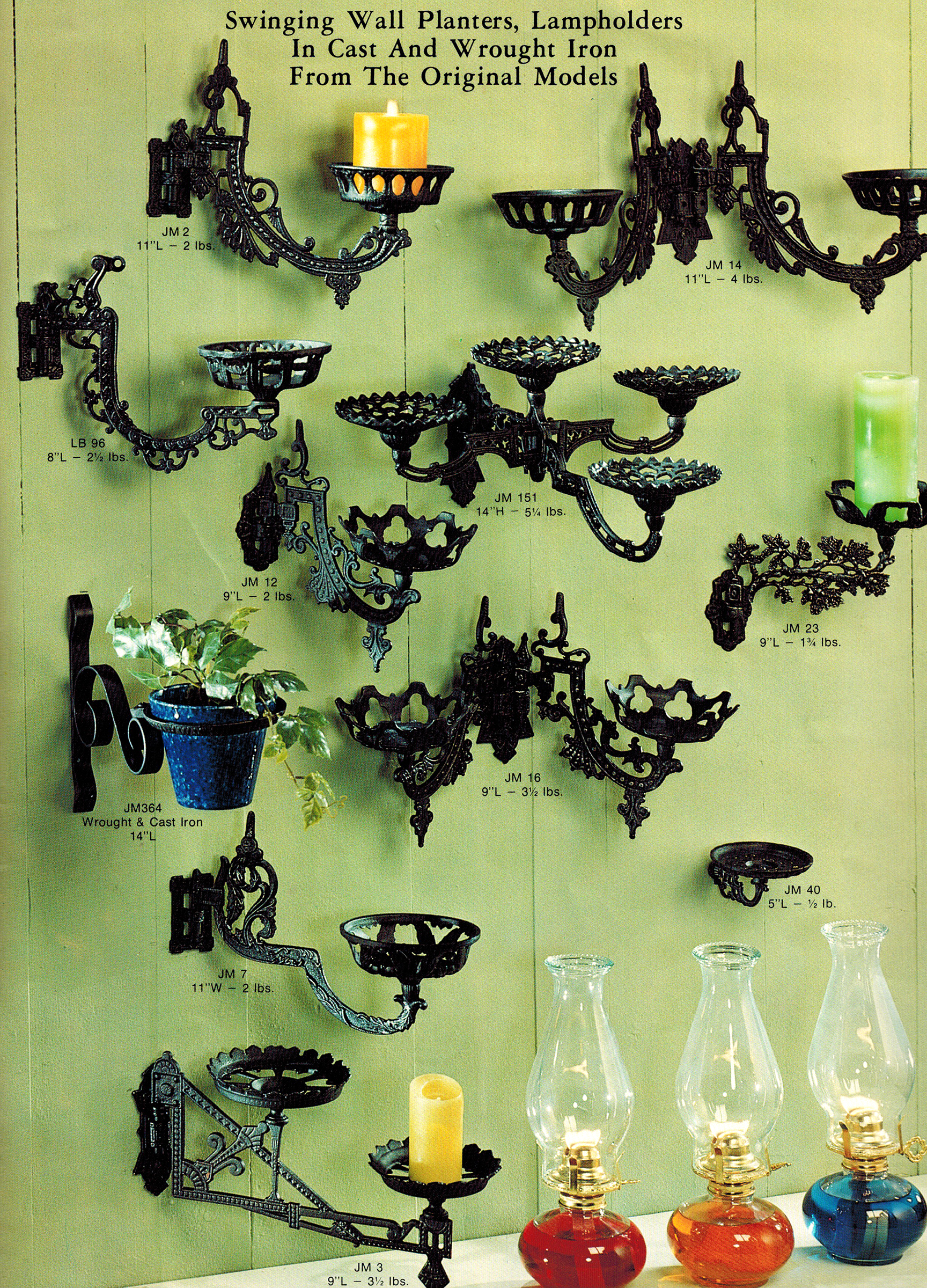 Page 9: Swinging Wall Planters, Lampholders In Cast And Wrought Iron From The Original Molds. This caption (cut off in image) appears below the 3 colored base hurricane lamps: LA Glass Lamp 13″ H. Will fit only JM2, JM 351, JM 352 and LB 48. Packed in box of 4.