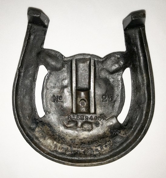 On the front are the words Good Luck. On the reverse is No. 25 and the British Registered Design number Rd 589405 for the year 1912. By my measurements this trivet is 6″ long and 5 1/2″ wide.